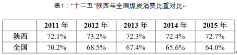 “十二五”以來,陜西煤炭消費(fèi)占能源消費(fèi)總量的比重始終高于全國平均水平(表1),可看出,“十二五”期間,全國煤炭消費(fèi)比重呈遞減態(tài)勢,而陜西煤炭消費(fèi)占能源消費(fèi)比重基本穩(wěn)定在72%左右,且其與全國的差距不斷增大,這表明陜西煤炭工業(yè)作為全省能源工業(yè)支柱的局面沒有發(fā)生根本改變。