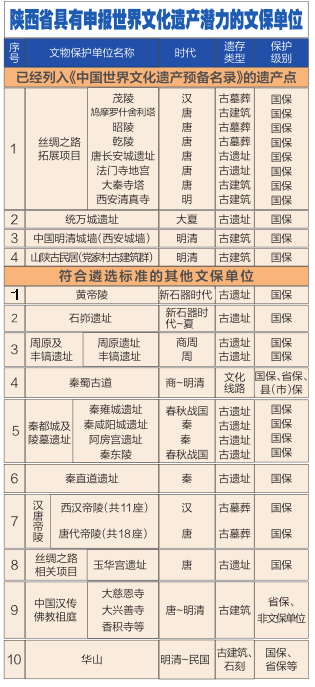 依據(jù)世界申遺遴選標準,結(jié)合陜西省遺產(chǎn)實際狀況與保護現(xiàn)狀,選定了兩大類文物點,第一類是已經(jīng)列入《中國世界文化遺產(chǎn)預備名單》的文化遺產(chǎn),共4處16個文物點;第二類是《陜西省申報世界文化遺產(chǎn)工作規(guī)劃》列入的擬申報遺產(chǎn)點,包括漢唐帝陵、石峁遺址、黃帝陵、周原及豐鎬遺址、秦蜀古道(蜀道)、秦都城及陵墓遺址、玉華宮遺址、秦直道遺址、中國漢傳佛教祖庭、華山等10處44個文物點。