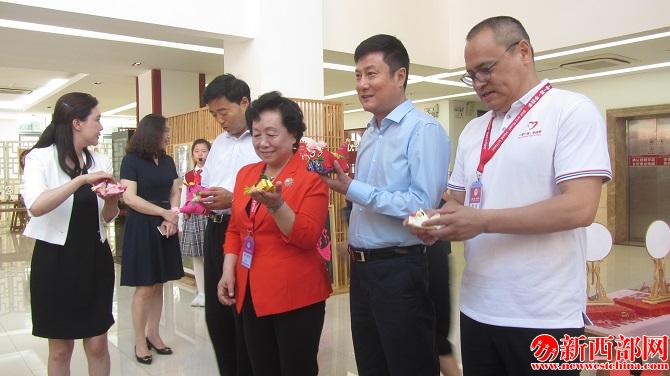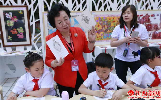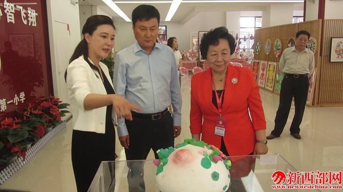 西安市曲江第一小學(xué)校長陳娟向陜西省人大常委會副主任郭大為和“知心姐姐”盧勤介紹學(xué)生手工作品。