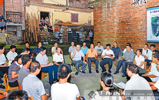 8月17日,自治區(qū)黨委書記、自治區(qū)人大常委會(huì)主任彭清華來到河池市羅城仫佬族自治縣榕木村寨洲屯,實(shí)地走訪調(diào)研精準(zhǔn)扶貧工作。晚飯后,彭清華與當(dāng)?shù)馗刹咳罕妵谕椭行衿荷?,共商村屯脫貧大?jì)。記者 黃克/攝