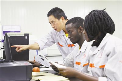 近日,在中國(guó)—烏干達(dá)國(guó)際產(chǎn)能合作工業(yè)園的儀器分析室里,中烏兩國(guó)科研人員在對(duì)當(dāng)?shù)氐牡V石樣品進(jìn)行分析。