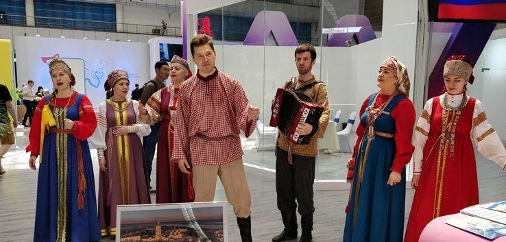 來(lái)自主賓國(guó)俄羅斯聯(lián)邦現(xiàn)場(chǎng)表演的歌舞吸引了一大批客商、游客駐足欣賞。