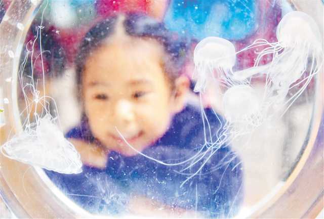 10月17日,巴南展區(qū),美麗的水母讓小朋友流連忘返。