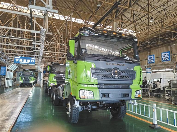 4月28日,在陜汽總裝廠,帶有SHACMAN標識的重卡完成總裝,即將銷往“一帶一路”沿線國家和地區(qū)。 記者 沈謙攝