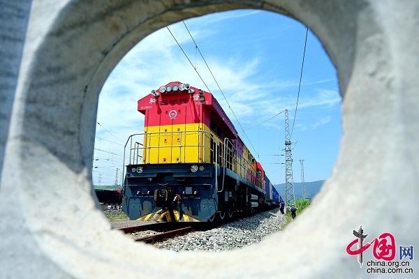 7月18日,滿載貨物的西部陸海新通道班列在魚嘴站正準(zhǔn)備發(fā)車。中國(guó)網(wǎng)發(fā) 雷釗/攝