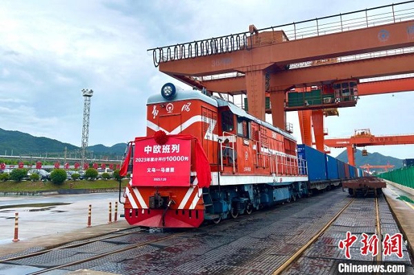 7月29日10時(shí)18分,隨著中歐班列(義烏—馬德里)從義烏西站開出,今年以來中歐班列累計(jì)開行達(dá)10000列。(國鐵集團(tuán)供圖)
