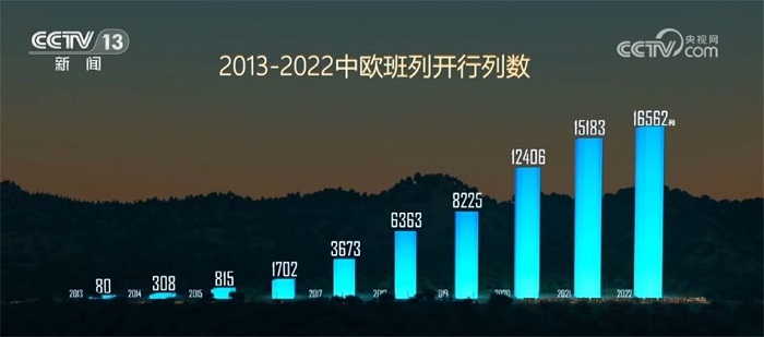 開(kāi)展前,“中歐班列—進(jìn)博號(hào)”從德國(guó)杜伊斯堡發(fā)車,裝載70標(biāo)箱的歐洲各國(guó)貨物,運(yùn)行11000多公里,歷時(shí)16天抵達(dá)上海。今年是共建“一帶一路”倡議十周年,繁榮的背后是中歐班列的井噴式增長(zhǎng)。2013年,全年開(kāi)行數(shù)量只有80列。隨后的四年間,每年都以超過(guò)100%的速度大幅增長(zhǎng)。到2020年突破一萬(wàn)列大關(guān),此后一直保持在一萬(wàn)列以上,十年增長(zhǎng)206倍。