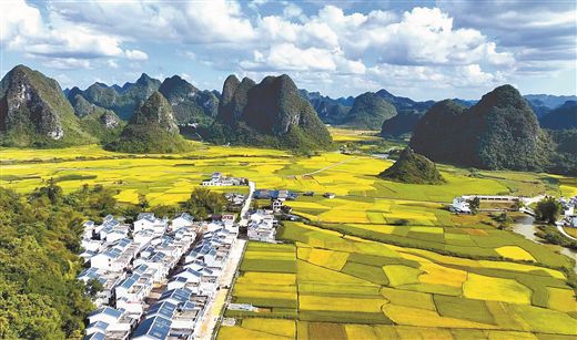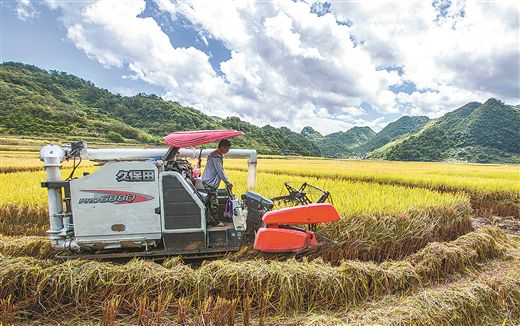 2023年,廣西耕地質(zhì)量平均等級達到5.77級,促進糧食總產(chǎn)量達到1395.36萬噸。圖為西林縣平別村水稻喜獲豐收。李世華攝