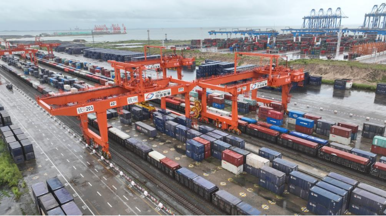 欽州鐵路集裝箱中心站自動化龍門吊正在進行裝車作業(yè)。(中國鐵路南寧局集團有限公司供圖)