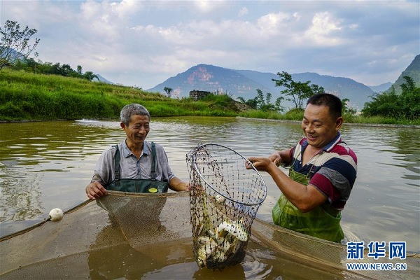 冷水魚(yú)養(yǎng)殖戶在魚(yú)塘里撈魚(yú)(2017年9月攝)。新華社發(fā)