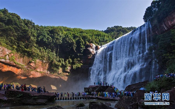 游客在赤水市大瀑布4A級(jí)景區(qū)游覽(2016年10月攝)。新華社發(fā)