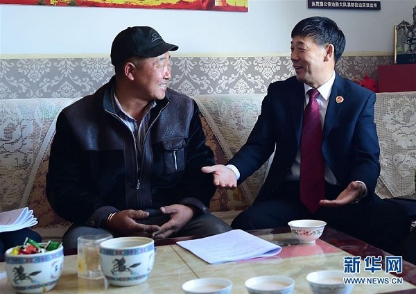 潘志榮(右)在達(dá)爾罕茂明安聯(lián)合旗滿都拉鎮(zhèn)巴音哈拉嘎查阿迪雅家傳達(dá)十九大精神(11月2日攝)。新華社記者 賈立君 攝