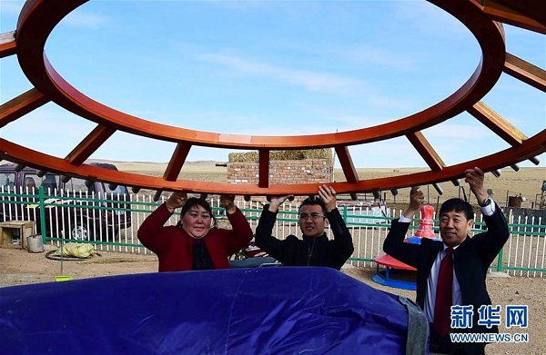 潘志榮(右)把包頭市人民檢察院購買的新式蒙古包送到達(dá)爾罕茂明安聯(lián)合旗滿都拉鎮(zhèn)巴音哈拉嘎查群眾烏仁其木格家(11月2日攝)。 新華社記者 賈立君 攝
