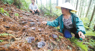 近年來,廣西柳州市融水苗族自治縣四榮鄉(xiāng)榮地村結(jié)合當(dāng)?shù)厣鷳B(tài)特點(diǎn),按照“一村一品”的脫貧思路,采取“公司+科研單位+基地+貧困戶”的模式,引導(dǎo)貧困群眾在杉木林下種植靈芝,統(tǒng)一優(yōu)質(zhì)種源,統(tǒng)一菌棒制作和供應(yīng),統(tǒng)一種植技術(shù)指導(dǎo),統(tǒng)一科學(xué)經(jīng)營管理模式,統(tǒng)一回收加工銷售,幫助苗山群眾增收致富,實(shí)現(xiàn)早日脫貧。種植靈芝成為當(dāng)?shù)厝罕娒撠毜闹饕乐?。圖為榮地村村民正在杉木林里管護(hù)靈芝。龐革平 譚凱興攝