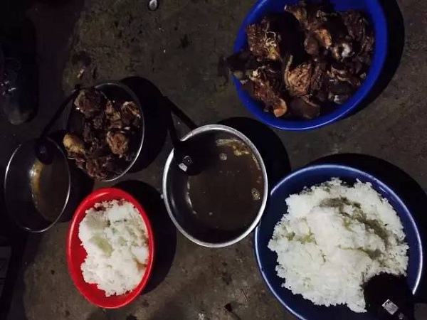 村支書很熱情的把我們迎進(jìn)他家,上午已經(jīng)殺豬烘烤,我們進(jìn)門時(shí),一大鍋豬肉正在煮燉,為客人殺一頭豬已經(jīng)是最高禮遇,別管是不是“江西黑”,立馬恭敬坐下,不是坐在地上,有小板凳,一肉一湯一飯擺在地上,黑乎乎的那盆是柴火烘烤的豬內(nèi)臟和豬頭。