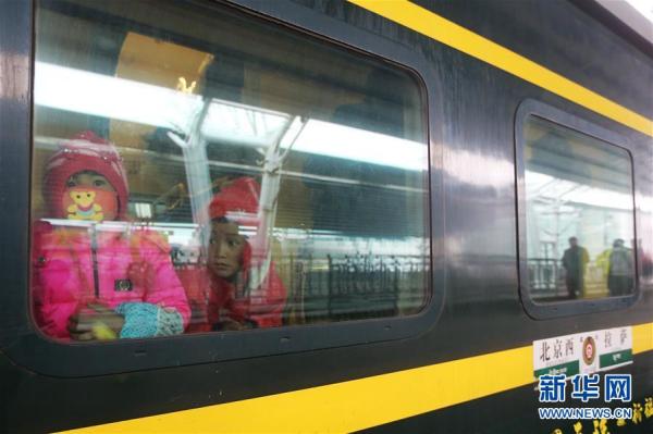 2015年11月23日,患有先天性心臟病的7歲小朋友楊文芳(左)乘坐火車抵達北京西站。當日,來自青海省海西蒙古族藏族自治州的13名先心病貧困患兒,在家人和當?shù)馗刹康呐阃碌竭_北京。他們將住進清華大學第一附屬醫(yī)院進行為期10天的免費手術治療。海西州地處青藏高原,由于海拔高,兒童先天性心臟病患病比例較高。在“鐵路援青”工作的推動下,經中國鐵路總公司積極協(xié)調,團中央中國青少年發(fā)展服務中心、愛佑慈善基金會和清華大學第一附屬醫(yī)院在海西啟動“心起點”先天性心臟病兒童救助行動。鐵路總公司援青干部還籌集資金用于患兒及家長赴京治療路費、住宿費補貼,最大程度減輕貧困患兒家庭負擔。新華社記者 邢廣利 攝