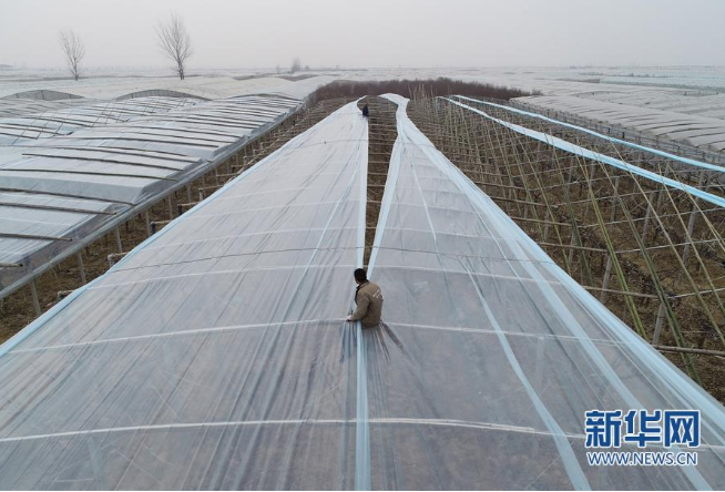 小坡村村民在防雨大棚上鋪新塑料膜(3月1日無(wú)人機(jī)拍攝)。新華社記者 邵瑞 攝