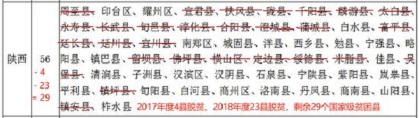 23個(gè)退出貧困縣為:西安市周至縣,寶雞市扶風(fēng)縣、太白縣、麟游縣、千陽(yáng)縣、隴縣,咸陽(yáng)市永壽縣、淳化縣、旬邑縣、長(zhǎng)武縣,銅川市宜君縣,渭南市澄城縣、合陽(yáng)縣、蒲城縣、富平縣,延安市宜川縣、延川縣,榆林市綏德縣、米脂縣、吳堡縣,漢中市留壩縣,安康市鎮(zhèn)坪縣,商洛市鎮(zhèn)安縣。