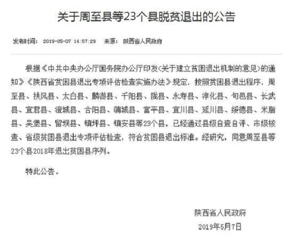 陜西傳媒網(wǎng)訊(記者 王海濤 程偉)5月7日,陜西省人民政府門戶網(wǎng)站發(fā)布公告,2018年陜西省共有23個(gè)貧困縣退出貧困縣序列。至此陜西已累計(jì)有27個(gè)貧困縣實(shí)現(xiàn)脫貧摘帽。這也標(biāo)志著延安、西安、寶雞、咸陽(yáng)4個(gè)市率先在全省實(shí)現(xiàn)所有貧困縣脫貧摘帽。