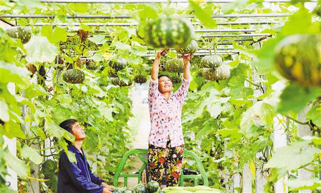 梁平區(qū)云龍鎮(zhèn)三清村,村民在蔬菜基地采摘南瓜。特約攝影 劉輝