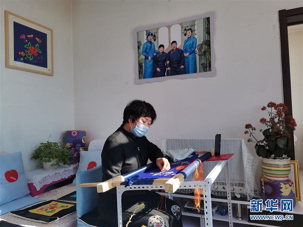 內(nèi)蒙古興安盟科爾沁右翼中旗繡娘王金蓮在家通過手機(jī)視頻教授蒙古族刺繡(2020年2月27日攝)。新華社發(fā)(白俊華攝)