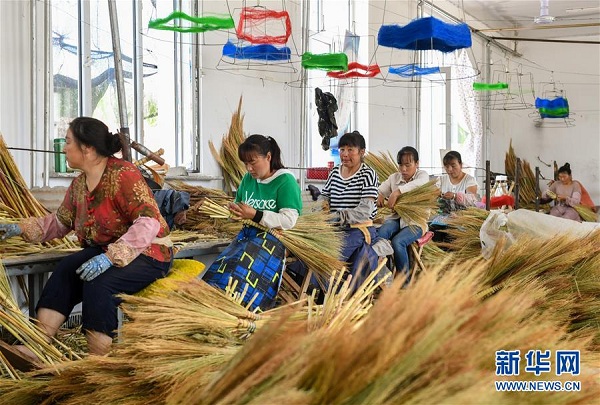 貧困戶在內(nèi)蒙古赤峰市巴林左旗林東鎮(zhèn)扶貧車間內(nèi)制作笤帚(2019年8月5日攝)。新華社記者 彭源 攝