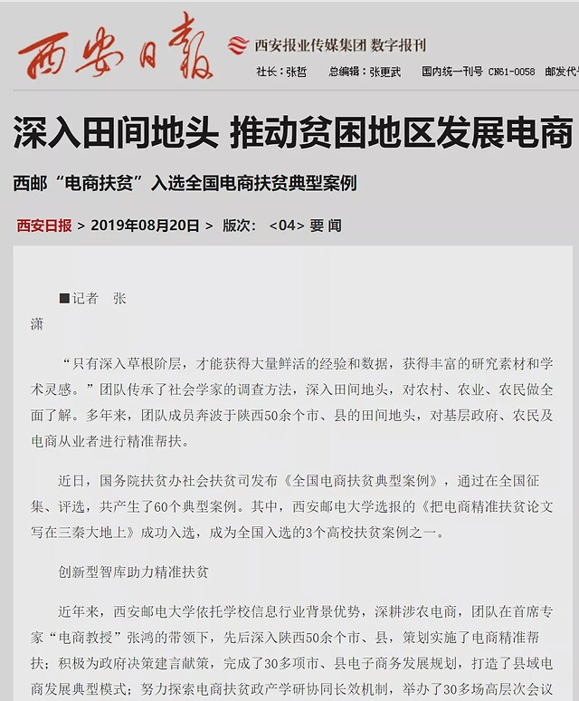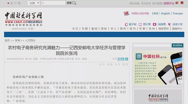 成果先后被《中國(guó)教育報(bào)》、《人民郵電報(bào)》、《陜西日?qǐng)?bào)》、《人民網(wǎng)》、《新華網(wǎng)》、《中國(guó)社會(huì)科學(xué)網(wǎng)》、《西部網(wǎng)》等媒體采訪報(bào)道百余次。代表性媒體報(bào)道:《中國(guó)教育報(bào)》2017年3月21日頭版頭條報(bào)道《“電商教授”張鴻》;《中國(guó)社會(huì)科學(xué)網(wǎng)》2016年9月21日?qǐng)?bào)道《農(nóng)村電子商務(wù)研究充滿魅力——記西安郵電大學(xué)經(jīng)濟(jì)與管理學(xué)院院長(zhǎng)張鴻》等。