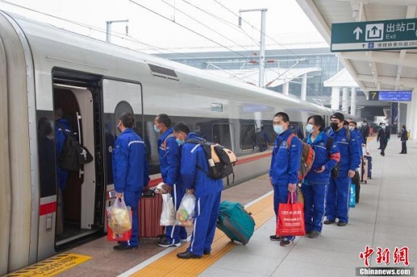 資料圖:返崗務(wù)工人員有序上車。張暢 攝