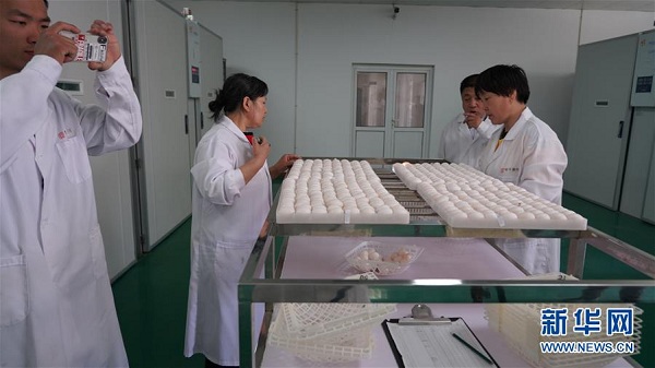 在北京市農(nóng)業(yè)產(chǎn)業(yè)化重點(diǎn)龍頭企業(yè)和阜平縣共建的阜平硒鴿健康產(chǎn)業(yè)園內(nèi),技術(shù)人員自行培育富硒乳鴿(4月29日攝)。新華社記者 陳旭 攝