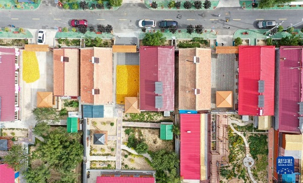 2021年10月3日拍攝的寧夏吳忠市紅寺堡區(qū)柳泉鄉(xiāng)永新村的“共享庭院”(無人機照片)。新華社記者 馮開華 攝