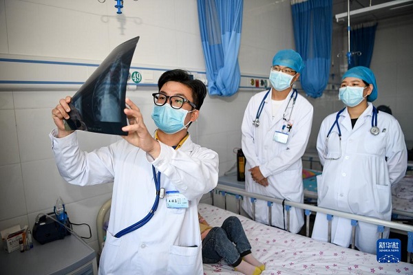 來自福建省泉州市第一醫(yī)院的醫(yī)生(左一)與寧夏吳忠市同心縣人民醫(yī)院醫(yī)生交流患者病情(2020年9月18日攝)。新華社記者 王鵬 攝