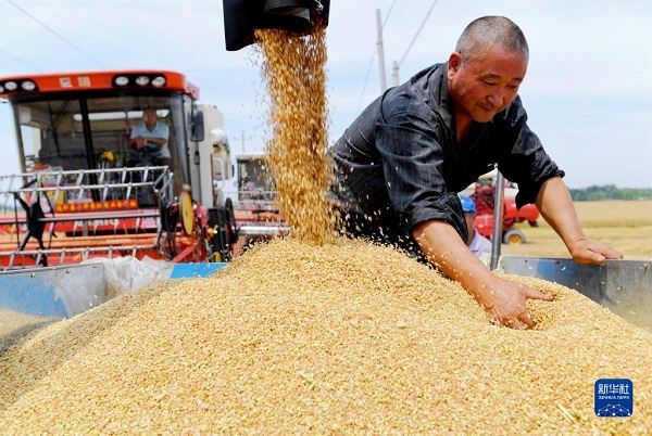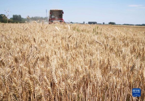 河北省衡水市阜城縣崔家廟鎮(zhèn)前磚門(mén)村農(nóng)民在麥田收獲小麥(2021年6月13日攝)。新華社記者 朱旭東 攝