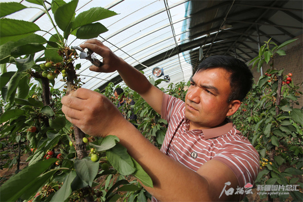 3月30日,工作人員在疏附縣現(xiàn)代農(nóng)業(yè)產(chǎn)業(yè)園粵港澳大灣區(qū)“菜籃子”生產(chǎn)基地櫻桃大棚里修剪嫩芽。