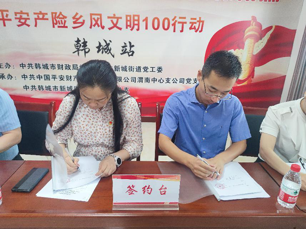 (新城街道黨工委副書(shū)記、主任韋一平和平安財(cái)險(xiǎn)渭南中心支公司副總經(jīng)理張學(xué)斌共同簽署《全面戰(zhàn)略合作協(xié)議書(shū)》)