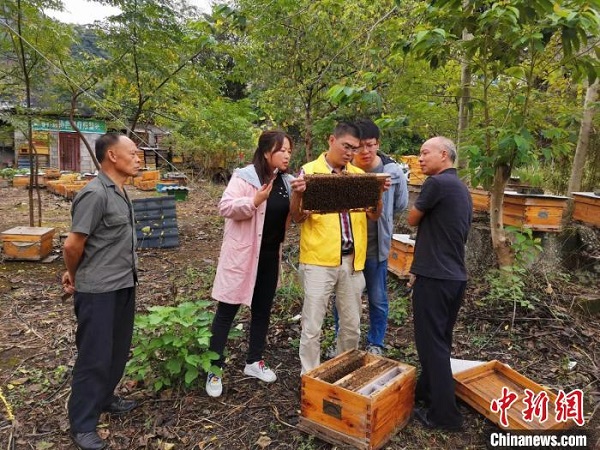 圖為科技特派員龍小飛(中)開展養(yǎng)蜂技術(shù)指導(dǎo)。重慶市科技局供圖