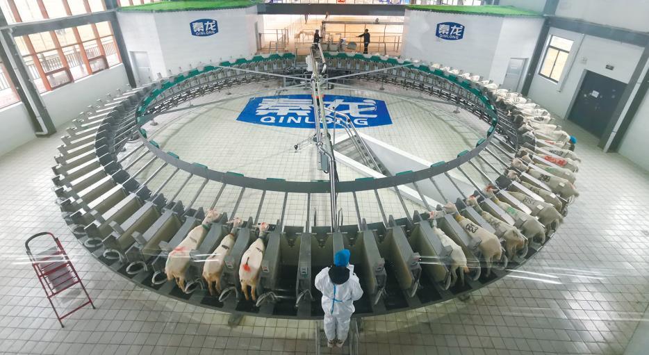 1月8日,在陜西秦龍良種奶山羊5G智慧產(chǎn)業(yè)園內(nèi),工作人員正在使用設備給奶山羊擠奶。