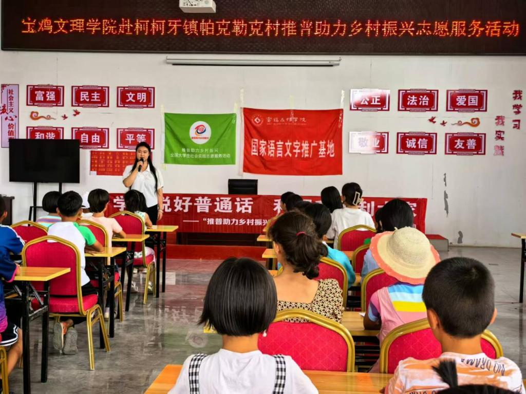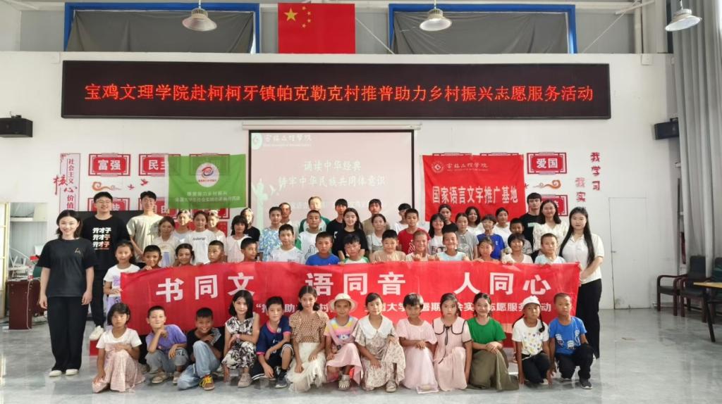 7月31日至8月6日,寶雞文理學(xué)院大學(xué)生服務(wù)隊赴新疆阿克蘇地區(qū)溫宿縣柯柯牙鎮(zhèn)帕克勒克村開展“書同文語同音人同心”推普助力鄉(xiāng)村振興社會實踐志愿活動,本次活動由國家語言文字推廣基地(寶雞文理學(xué)院)組織實施。駐村第一書記張玉良、基地核心成員何艷萍副教授以及近100名學(xué)生參加了開班儀式。