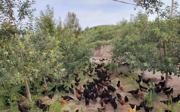 ▲劉虎在果園發(fā)展林下養(yǎng)雞。(受訪者供圖)
