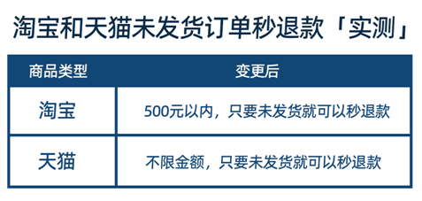 記者實測顯示,目前淘寶和天貓商家的未發(fā)貨商品訂單退款服務均有升級,其中,對500元以下的未發(fā)貨淘寶和天貓商品訂單申請退款,可以秒到賬。500元以上訂單,仍需要在商家審核后才可退款。