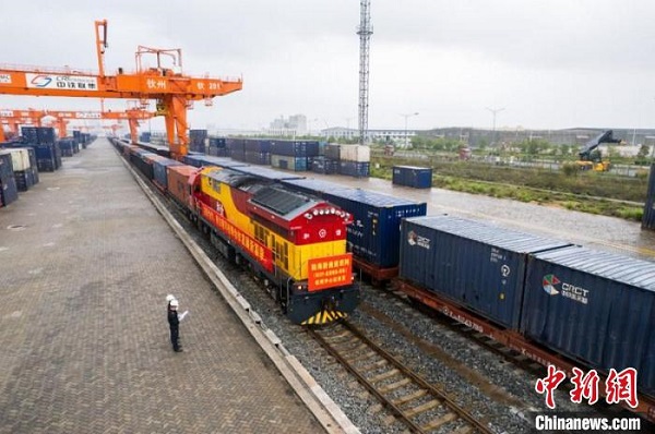 圖為海鐵聯(lián)運班列在欽州港片區(qū)發(fā)車。廣西商務(wù)廳供圖