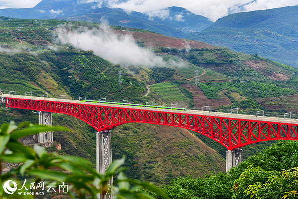 復(fù)興號(hào)動(dòng)車組列車馳騁在中老鐵路玉溪元江特大橋上。徐章位攝