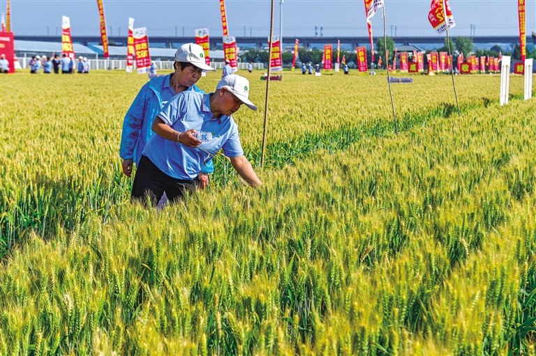 5月21日,2024年秦豐·偉隆黃淮麥區(qū)新品種推薦會在楊凌舉行。圖為觀摩團(tuán)成員在育種基地了解小麥特性、田間表現(xiàn)情況和高產(chǎn)栽培技術(shù)要領(lǐng)。記者 袁景智攝