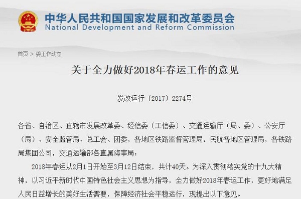 央視網(wǎng)消息:據(jù)國家發(fā)改委網(wǎng)站消息,為全力做好2018年春運(yùn)工作,更好地滿足人民日益增長的美好生活需要,保障經(jīng)濟(jì)社會平穩(wěn)運(yùn)行,國家發(fā)改委等九部門今日聯(lián)合印發(fā)《關(guān)于全力做好2018年春運(yùn)工作的意見》(以下簡稱“意見”)。2018年春運(yùn)從2月1日開始至3月12日結(jié)束,共計(jì)40天。經(jīng)相關(guān)部門會商預(yù)測,2018年春運(yùn)全國旅客發(fā)送量將達(dá)到29.8億人次,與上年春運(yùn)基本持平。