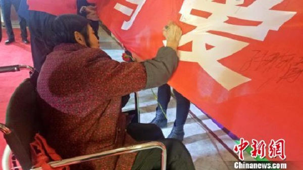 圖為一名殘疾人在公益者聯(lián)盟發(fā)起橫幅上簽下自己的名字。 張海雯 攝