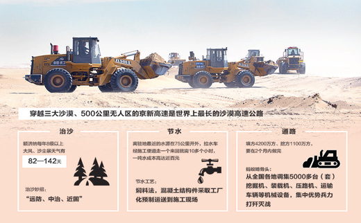 沙,本是建設(shè)者的敵人,但靠著現(xiàn)代建筑技術(shù),化敵為友有了可能。在風(fēng)積沙路段,建設(shè)者就地取材,以沙為原料筑造路基,使建設(shè)成本大為降低。