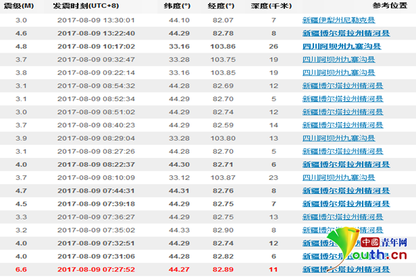 8月8日21時(shí)19分至8月9日13時(shí)30分,中國地震臺(tái)網(wǎng)測定的發(fā)生在四川和新疆的地震及余震情況。中國青年網(wǎng) 宋莉 網(wǎng)絡(luò)截圖。