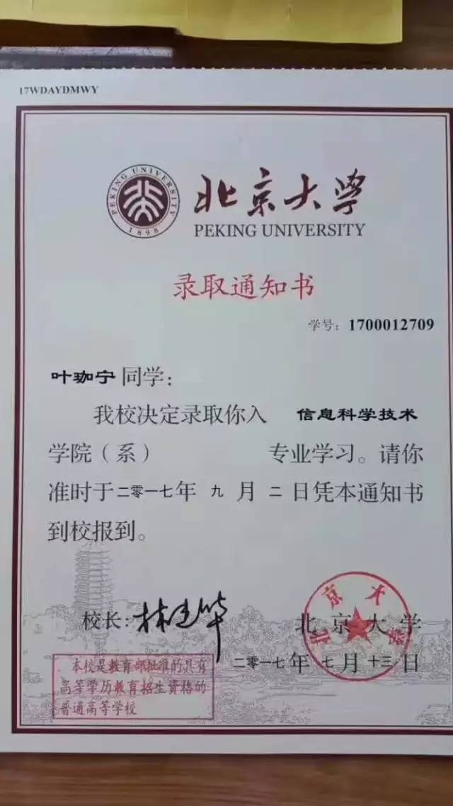 這幾天,諸暨的朋友圈都被一封北大錄取通知書刷爆了,這封通知書是寄給今年高三畢業(yè)的諸暨男孩葉珈寧的,它的特殊在于葉珈寧并沒(méi)有參加今年高考,在高二時(shí),他就已經(jīng)收到北大的預(yù)錄取通知書,確定保送,而且早在3年前,北大就已經(jīng)和他簽約,表示愿意降200分錄取這個(gè)諸暨天才少年。這一次,錄取通知書正式寄到。