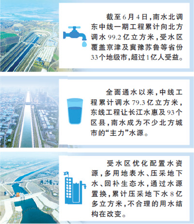 保供水,南水成為不少北方城市的“主力”水源。全面通水以來,中線工程累計(jì)調(diào)水79.3億立方米,在北京,南水占到自來水日供水量的73%,中心城區(qū)供水安全系數(shù)由1.0提升至1.2;在天津,主城區(qū)居民喝上南水,相當(dāng)于新增一條供水“生命線”;在河南,11個(gè)地市、37個(gè)縣用上南水,1800萬人受益;在河北,用水范圍覆蓋7個(gè)地級(jí)市、96個(gè)水廠。東線工程讓長江水惠及93個(gè)區(qū)縣,調(diào)入山東水量累計(jì)19.9億立方米,大大緩解了膠東半島和魯北地區(qū)的缺水問題。