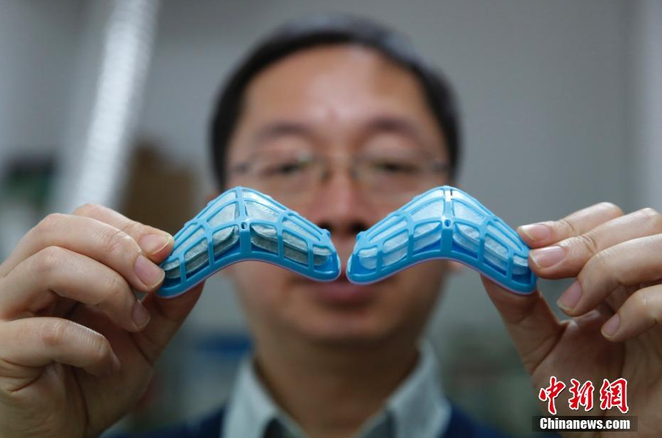 1月3日,北京化工大學(xué)高分子納米復(fù)合材料實(shí)驗(yàn)室劉勇教授通過(guò)臺(tái)式掃描電子顯微鏡,觀察近期使用后的防霾鼻罩濾芯上采集的霧霾顆粒,以及分析霧霾顆粒里面含有的各種元素。近日,北京持續(xù)霧霾天氣。圖為劉勇教授展示使用前后鼻罩濾芯。中新社記者 韓海丹 攝