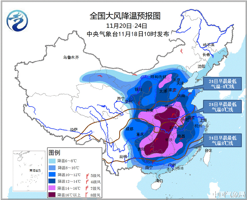 我國(guó)中東部大部地區(qū)將出現(xiàn)明顯降溫和大風(fēng)天氣。20日至24日,我國(guó)中東部大部地區(qū)日平均氣溫將普遍下降6~10℃,其中,西北地區(qū)東南部、華北西部和南部、黃淮中西部、江淮中西部、江南中西部、華南北部、西南地區(qū)東部氣溫將下降12~14℃,河南、湖北、湖南、貴州等地的部分地區(qū)降溫幅度可達(dá)16℃以上。期間上述地區(qū)伴有4~6級(jí)偏北風(fēng),東部和南部海區(qū)風(fēng)力有7~9級(jí)。